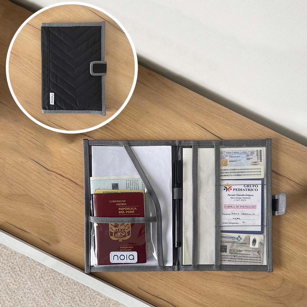 El Porta Documentos Noia te permite tener todos los documentos ordenados y en un solo lugar. Cuenta con espacios para colocar la cartilla de vacunación, los DNI, tarjetas del seguro, recetas médicas, así como también los pasaportes y boletos en caso de viajes.