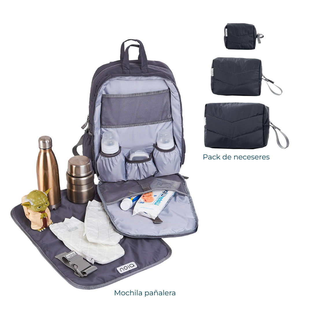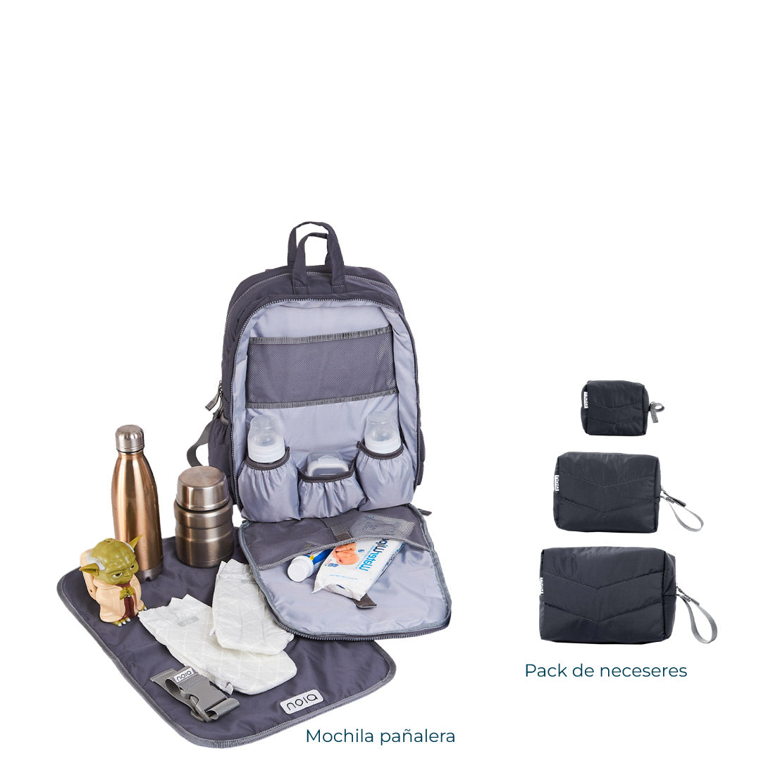 La mochila pañalera NOIA es muy ligera, está hecha de material impermeable, es ergonómica y muy cómoda. Cuenta con un sistema de organización inteligente para sacarle el máximo provecho al espacio, tiene múltiples bolsillos y uno especial para colocar los pañitos húmedos y poderlos usar de inmediato. Incluye un neceser y cambiador del mismo material.